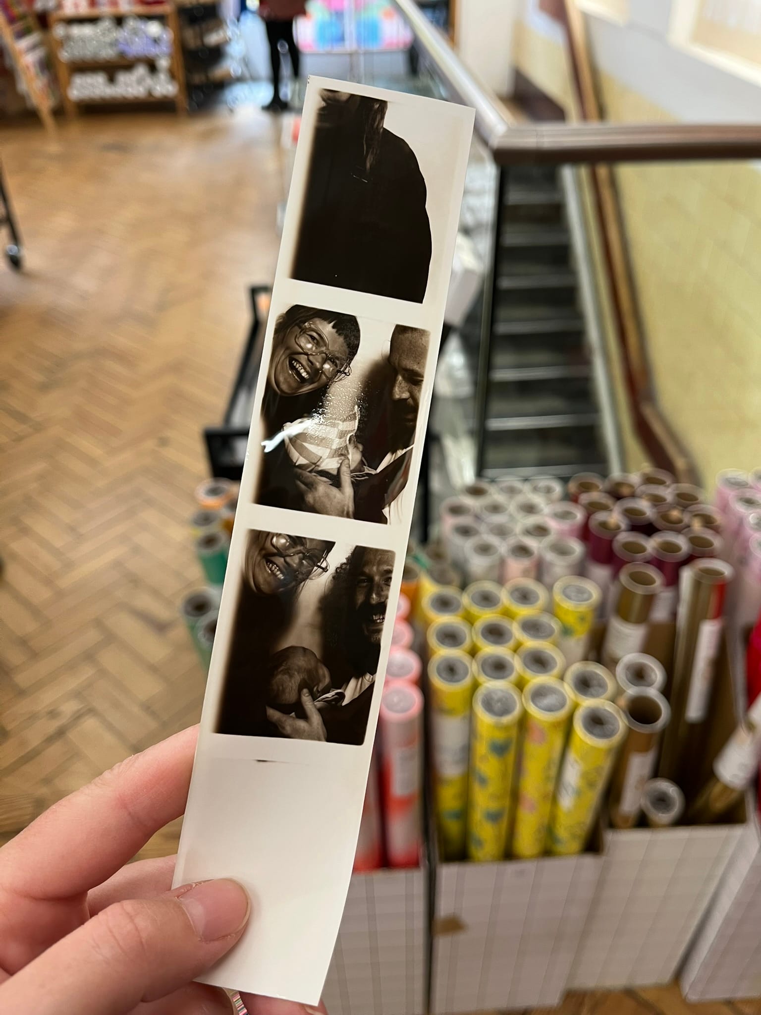 We tried to get a photo booth memento with the boy but it didn't go to plan. He hated being in the booth so we missed the first and last shot, and we couldn't get him to face the camera while in the carrier. Very funny though.