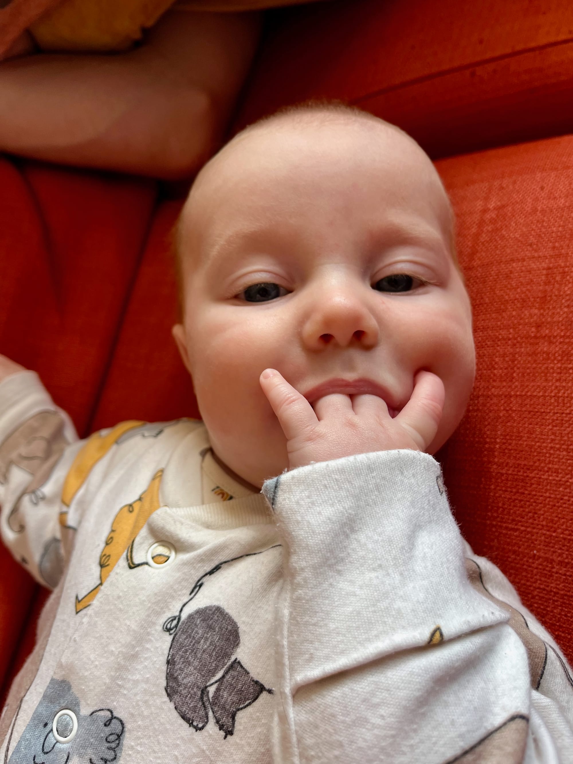 We're getting into the stage where everything needs to go into his mouth. It started maybe last week when he found his hands, then he learnt to suck his fingers. This morning he's gotten very consistent with putting a toy in his mouth.