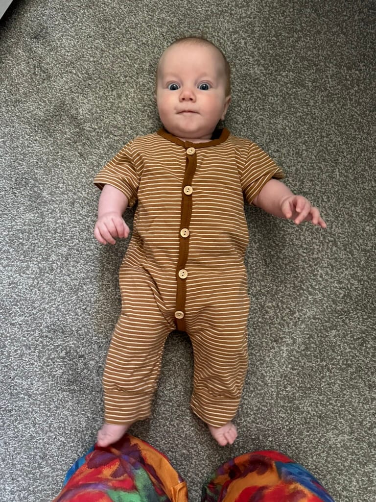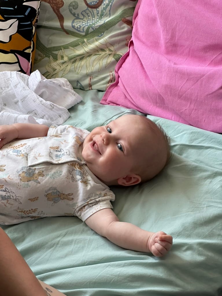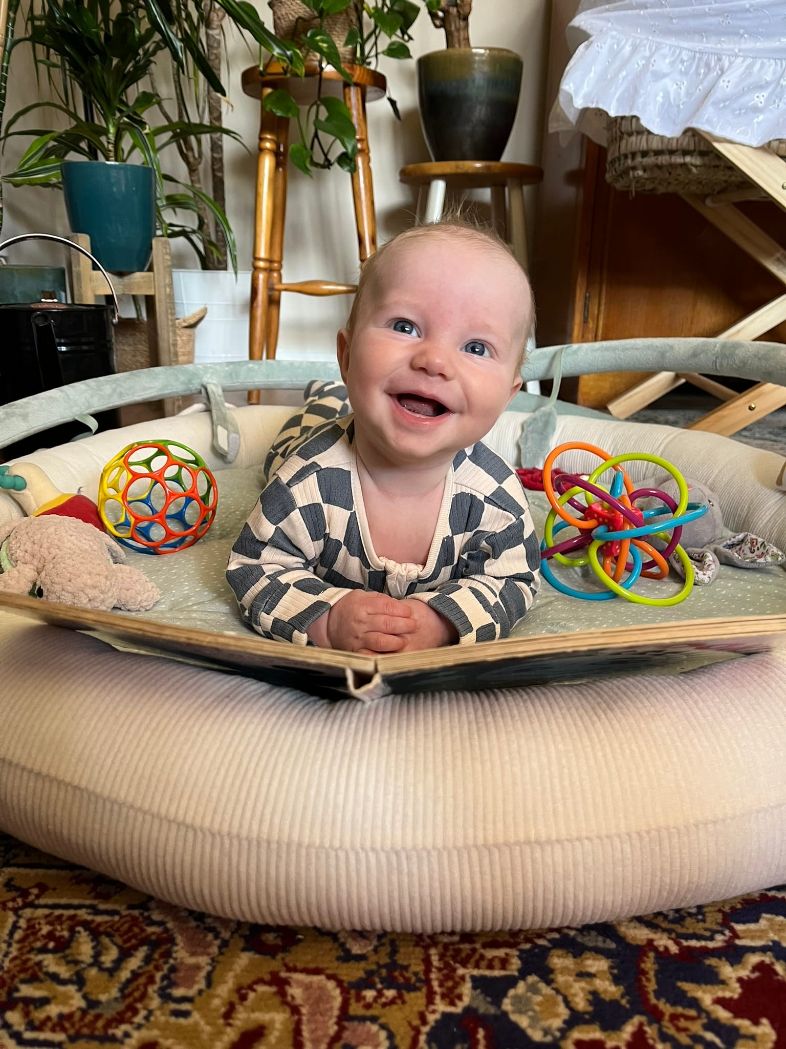 So last week he was putting everything in his mouth, great. However, from that he's learnt that he can grab and move things. So now he's grabbing everything! You putting his sleeve in his top, grabs it. You're putting the sticky tabs on his nappy, grabs them. Putting him to sleep at night, grabs your collar. Getting pissed off, grabs your arm hair.