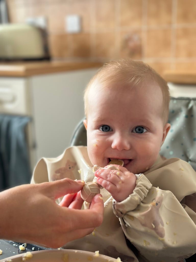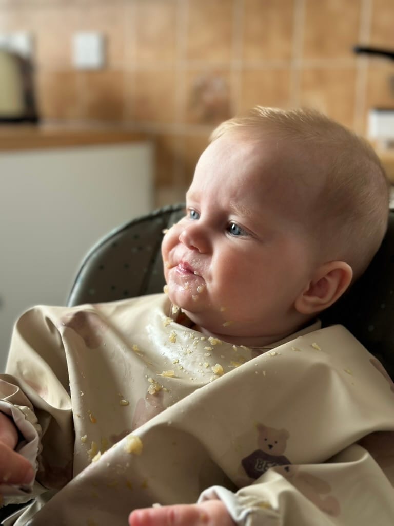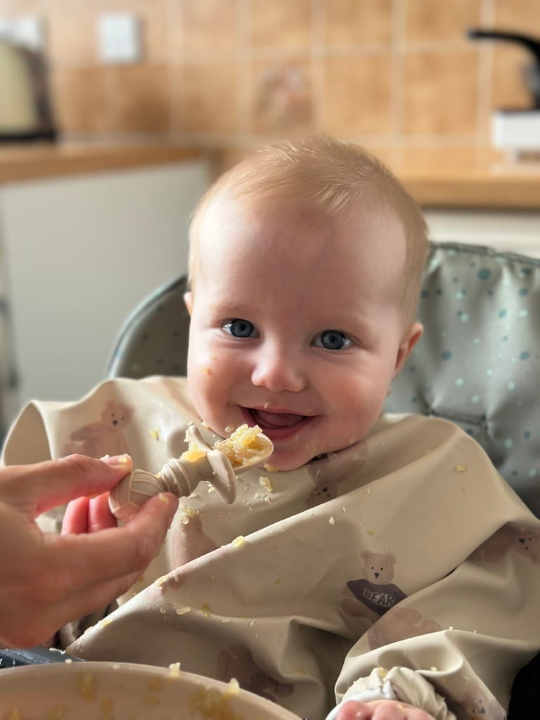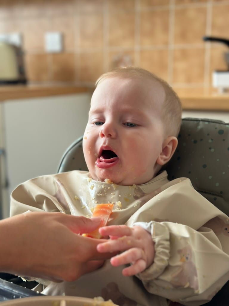 That's right, the boy is having his first taste of real food. Not that breast milk isn't real food, but like proper food. Wait, I mean solid food. What a joy. Tee has been talking about this day for so long. We were ready but the boy had a poorly tummy for a while so we put it on hold until he was showing signs of improvement. And that got better, so we got to steaming vegetables.