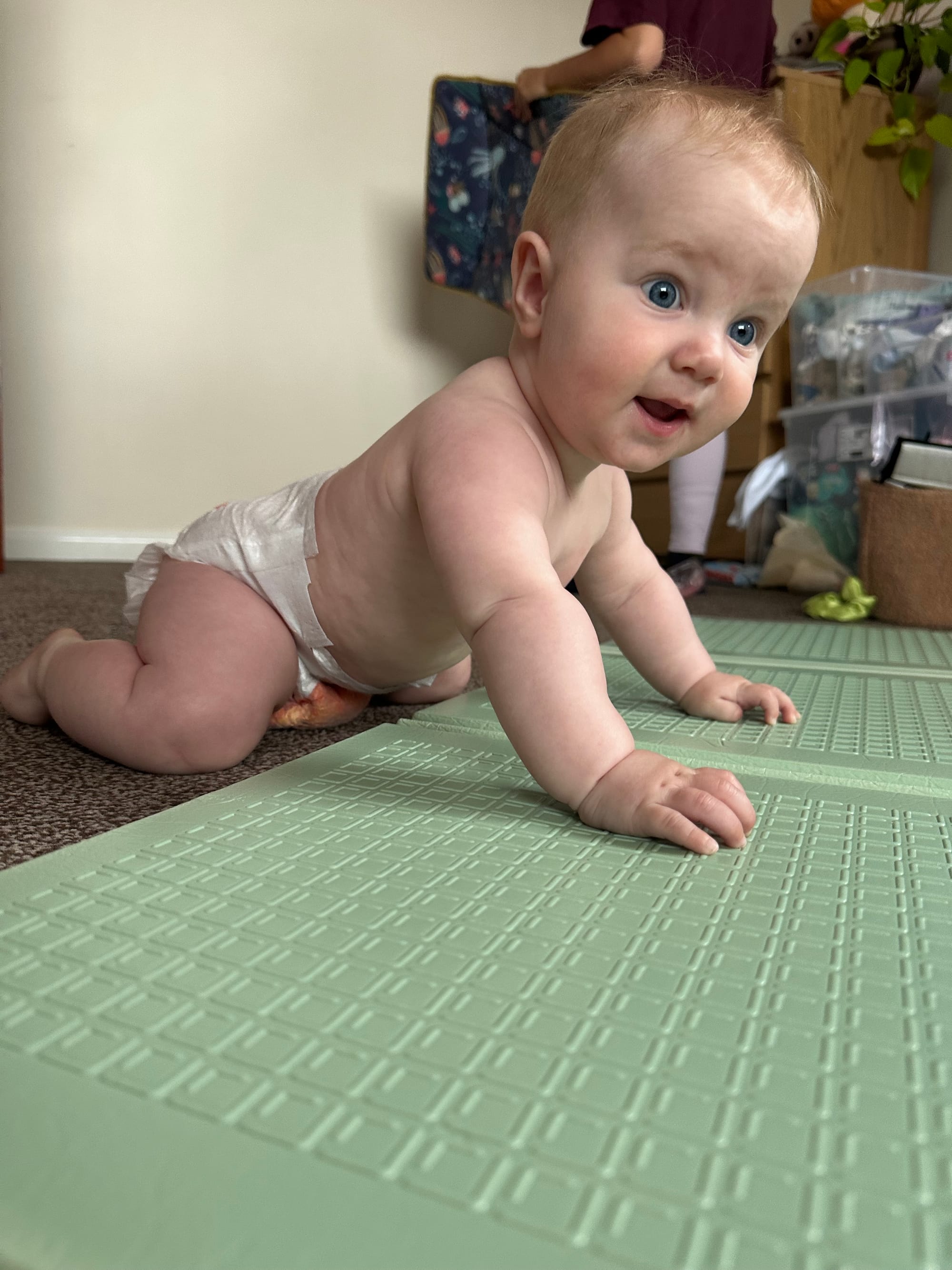 I think the boys first exercise was glute bridges. Before he could roll over or anything he would pick up his butt while lying on his back. Now he's loving the plank. He's really trying to crawl at the moment and is making good progress (still not forward progress). He's able to pick up his body weight on his hands and feet. He's also now making up onto his knees and shifting his body weight forwards and backwards. He's got the position down, just not the momentum. It'll come..