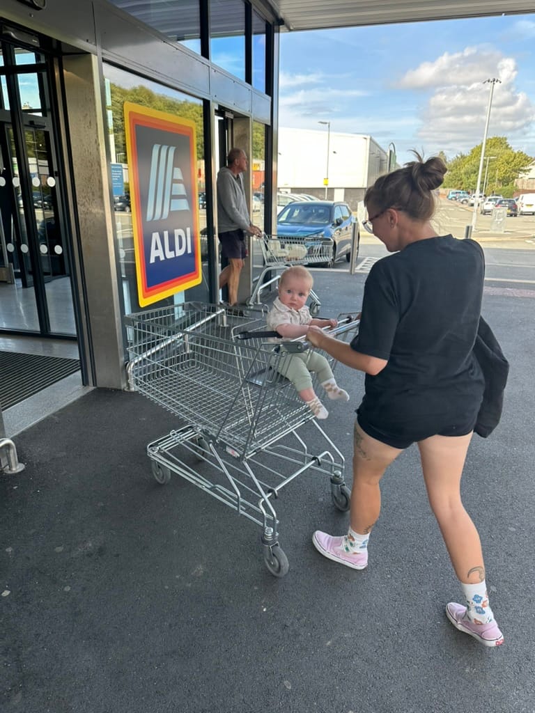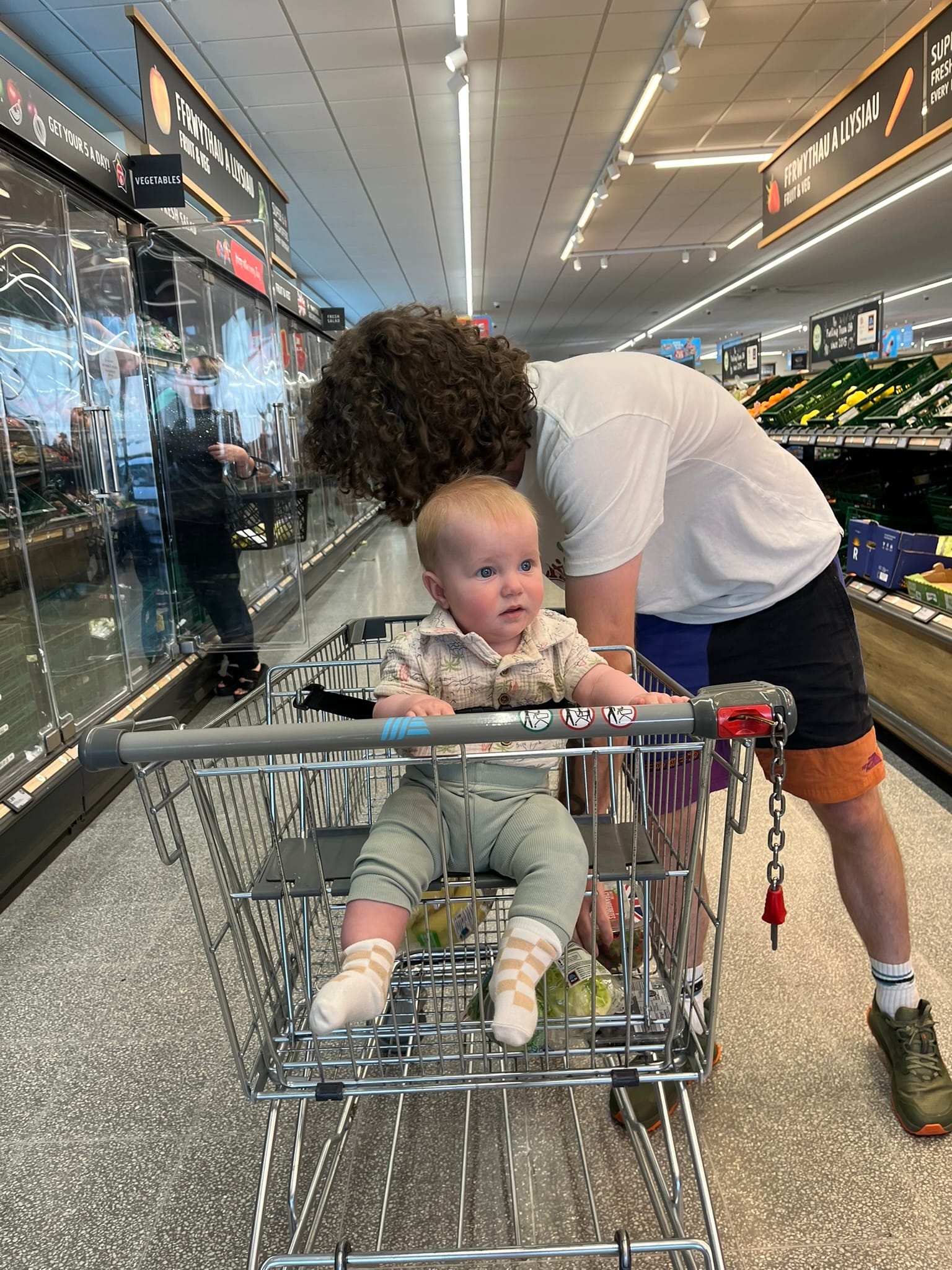The downside of a new car is figuring out your systems again. We've had the van so long it usually has everything ready to go. For example; shopping trolley token on the keys, 2 spare shopping bags, and almost always a baby carrier. Food shop ready. Tee has nothing in her car but it meant that Roland got to sit in the trolley for the first time.