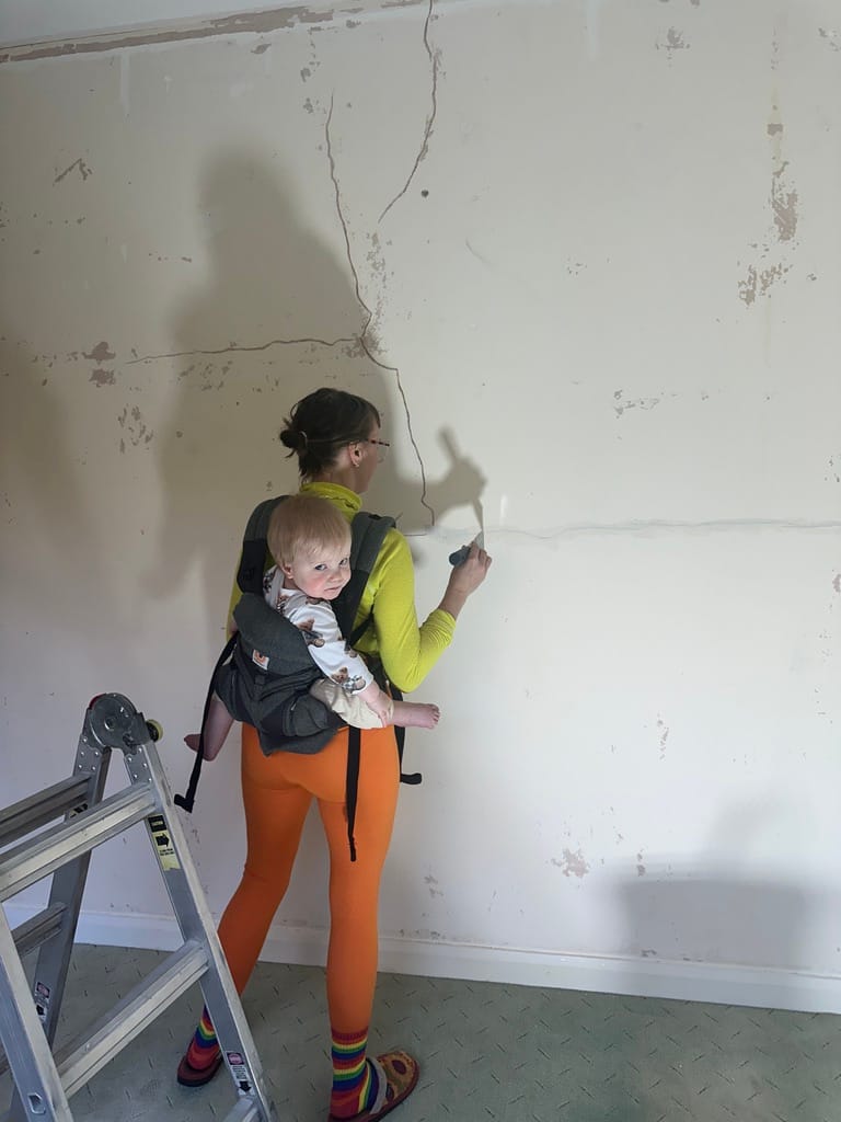 Jeho pokoj je teď hlavním cílem našich domácích rekonstrukcí. Řekli jsme si, že Rolanda vezmeme s sebou na jednu z prací. Přední nosítka jsou skvělá na nošení miminka, ale dost ztěžují jakoukoli práci. Když ho ale dáte do nosítka na záda, můžete se pustit do akce. Dokud se hýbete, je v pohodě klidně celé hodiny. Jakmile se ale zastavíte, je to jiný příběh. Bohužel tmelení prasklin je práce, při které se stojí na místě.