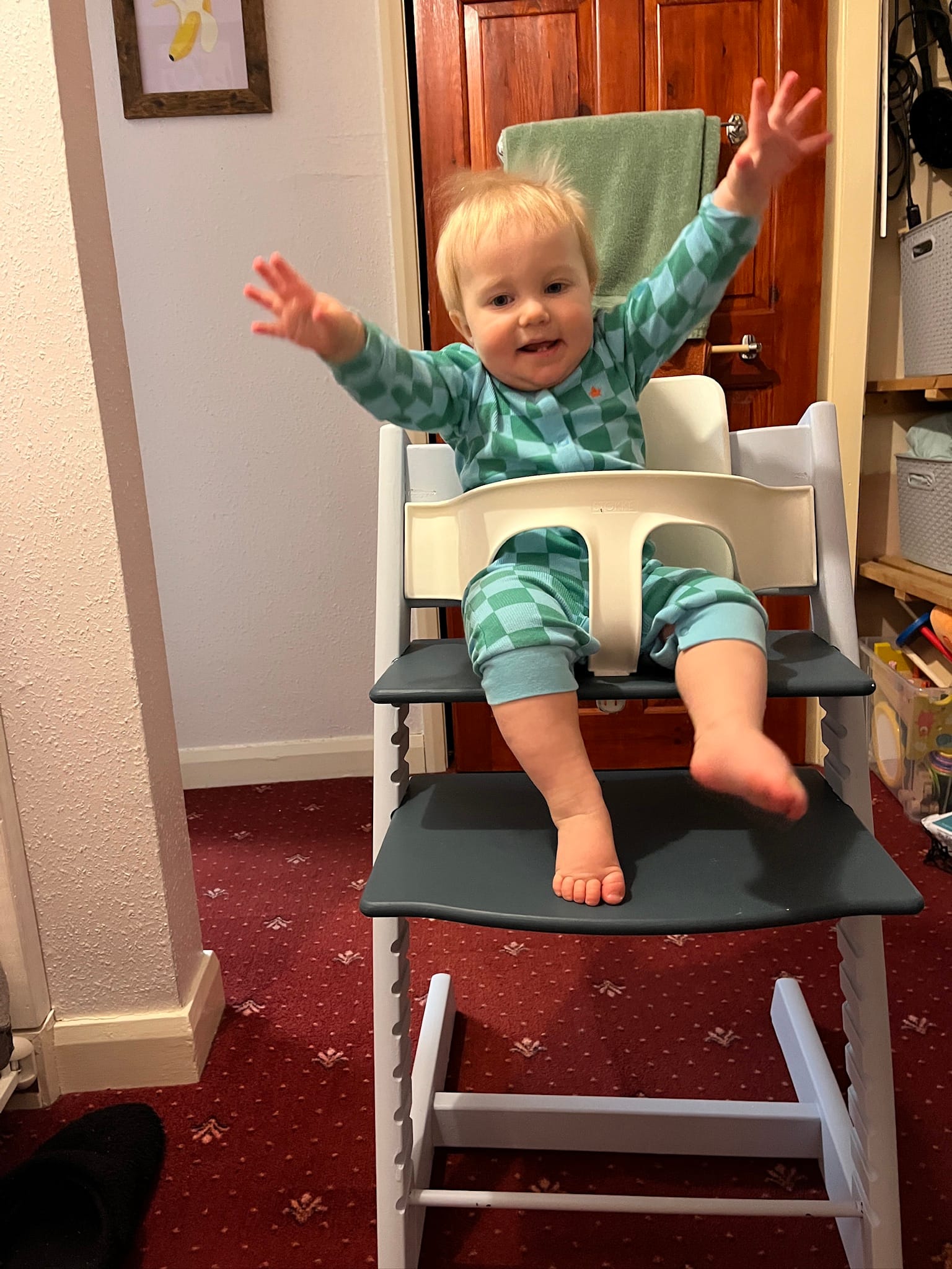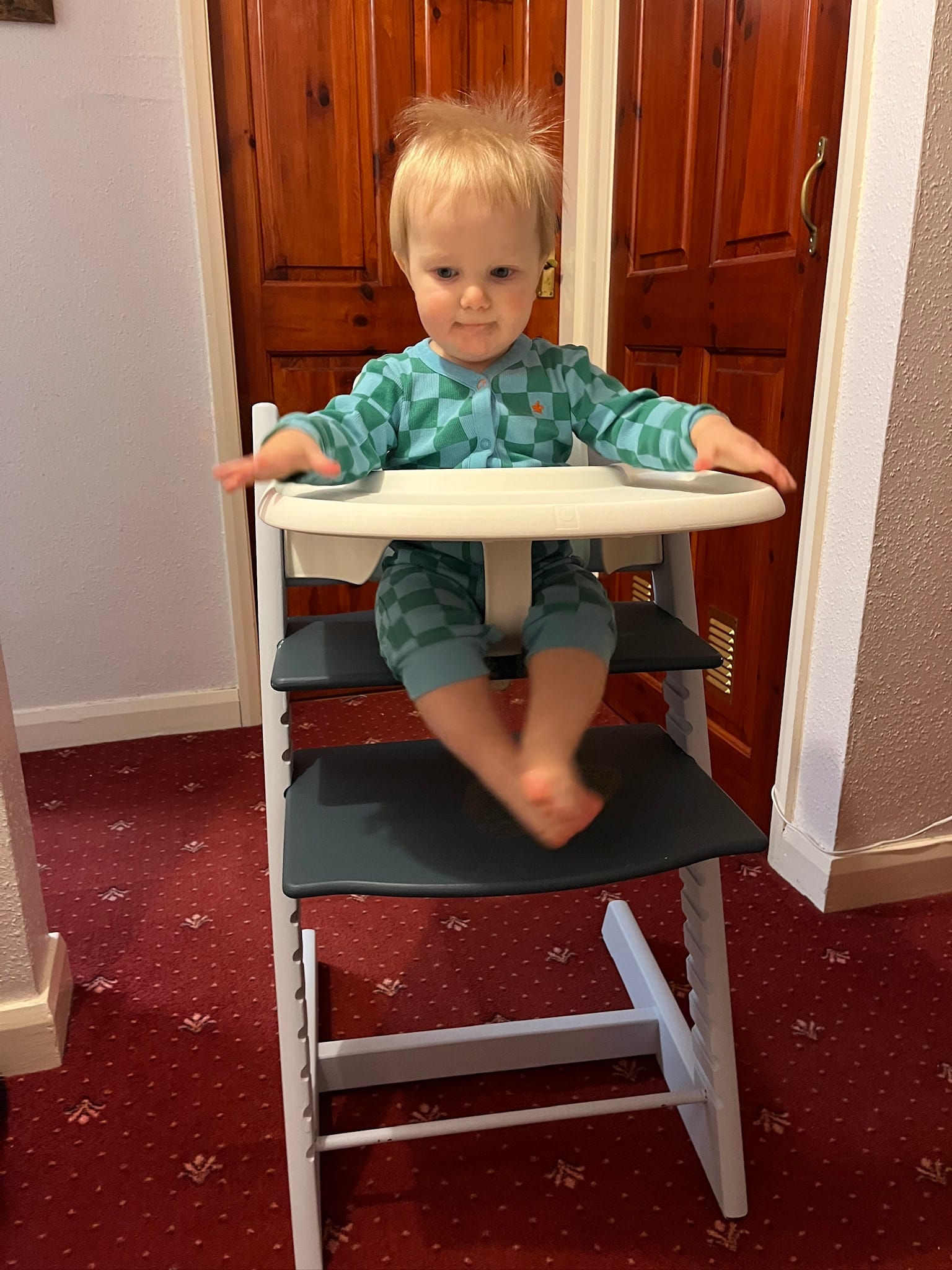 Když se Roland zase začal dobře rozjídat, přestal dobře jíst. A pokud jste dlouhodobí odběratelé, víte, že to znamená jediné… nelíbí se mu jeho židlička. Popravdě řečeno, nelíbila se ani nám. Měla dřevěný pultík, který byl na nic, protože 1) talíř na něm nedržel a 2) hrozně rychle se zašpinil. Plast má svoje využití a jídelní pultíky jsou rozhodně jedno z nich.