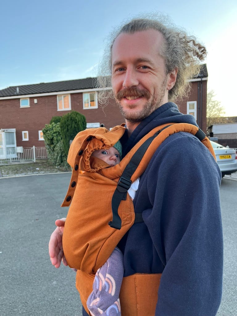 Bros rocking a sweet tan carrier now. I'm on the hunt for a leather Carhartt logo to slap on this bad boy. If you have one, please reach out. He looks bewildered but he does love it in there.