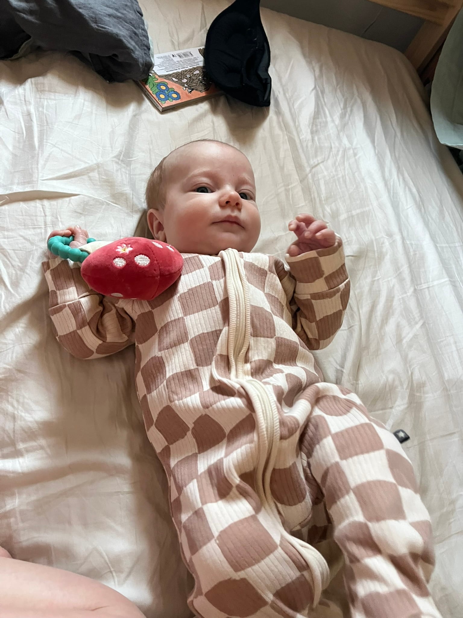 The picture of him holding a rattle was a momentous occasion. Babies are born with a grasp reflex, so anything that touches the palm of their hand they will grab onto. Meaning those extra cute moments of the first times he grabbed my finger meant nothing to him. But now he will be choosing to hold onto things. After showing him the rattle a few times, I gave it to him and he did not let go!