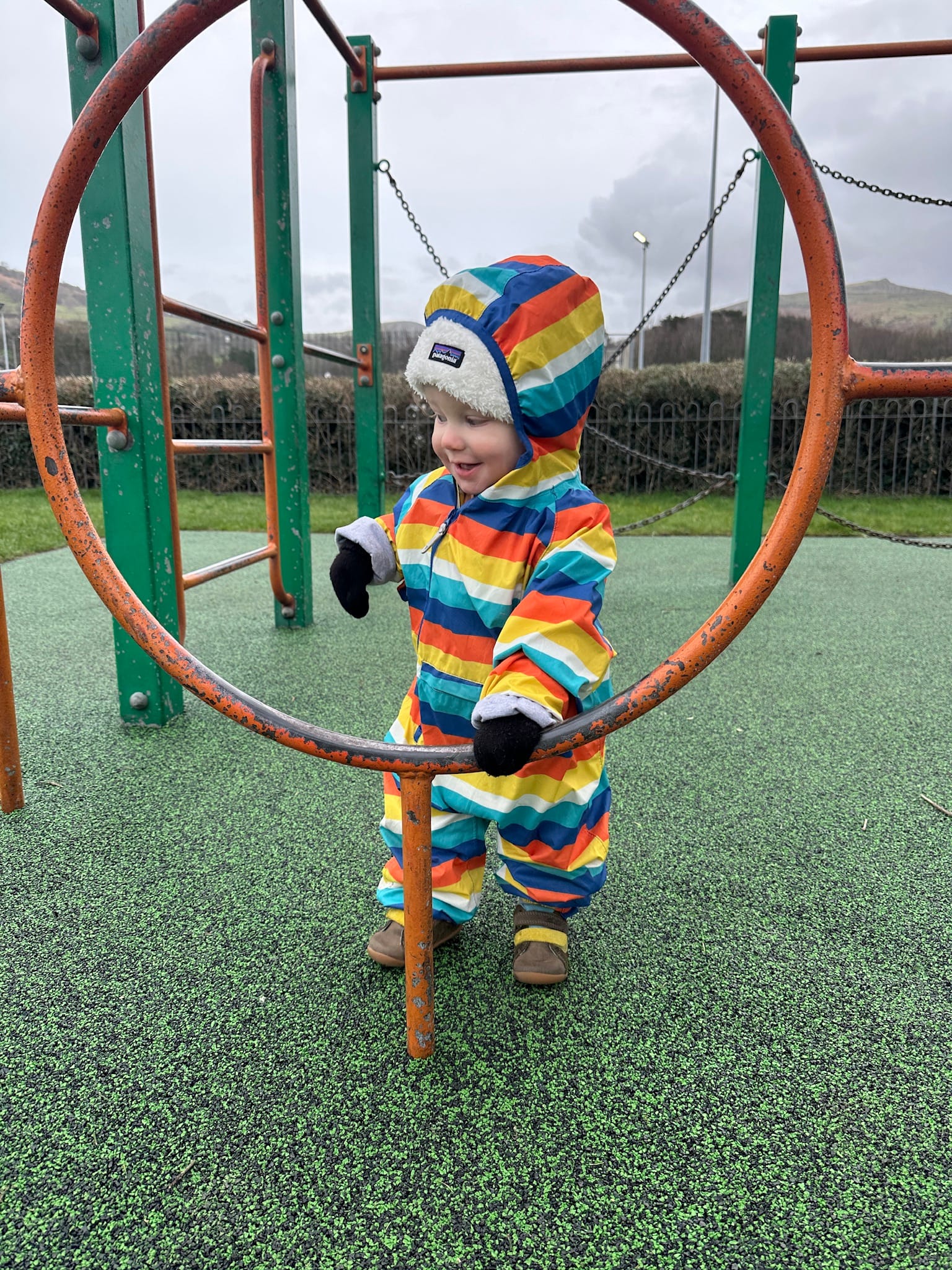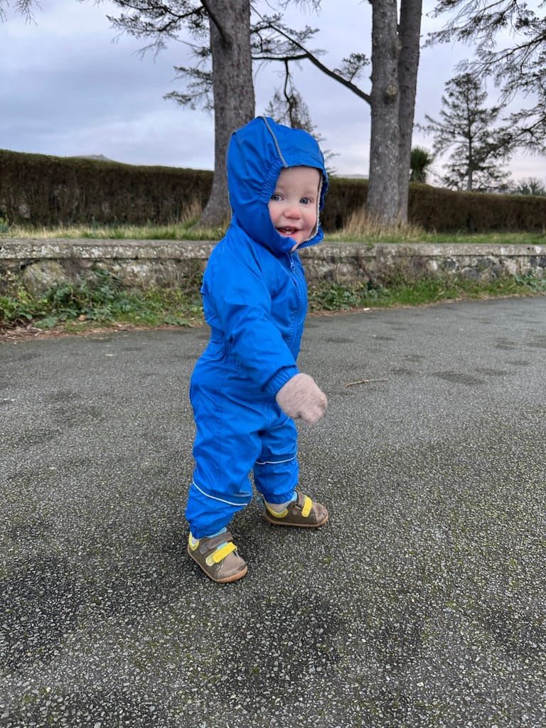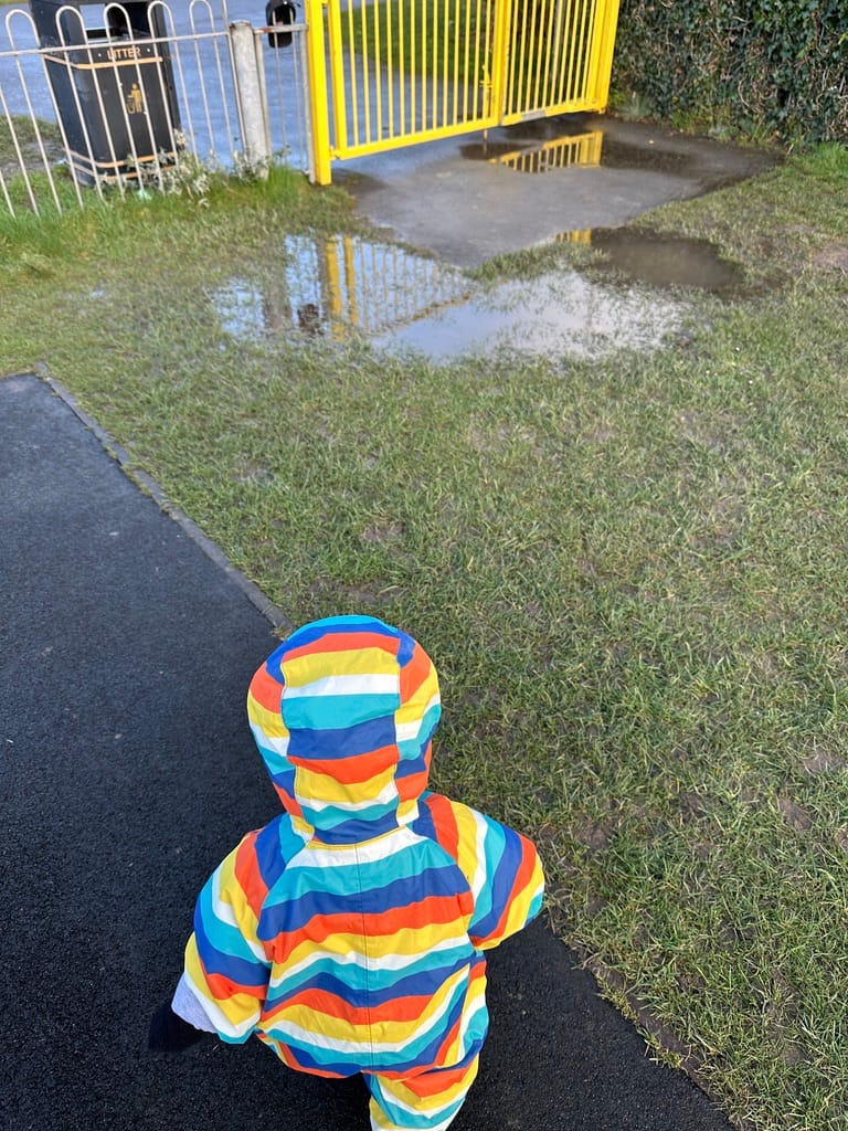 While it's been raining a lot here, we have been trying to get out to the park when we can. One day there was puddles and Roland was compelled to get in there. Sadly, and this is what I told him, his shoes aren't made for it. So we bought him some wellies so we can go splashing soon.