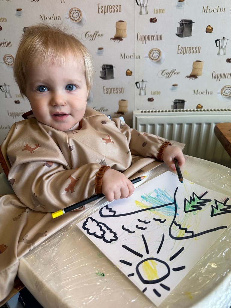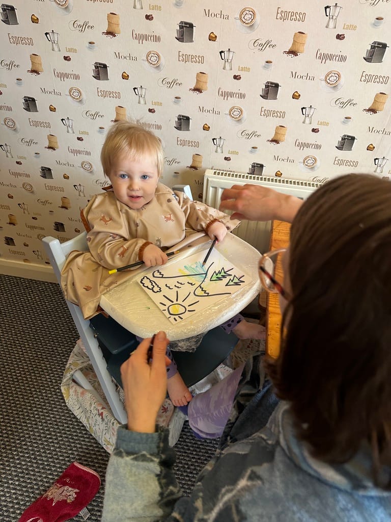 Tee odvádí skvělou práci – stará se o kluka celý den, zatímco já jsem v práci. A dělat pořád to samé, den co den, to člověka semele. A když je to dětská péče, tak dvojnásob. Tak přišla s trumfem: výtvarnou třídou. Roland pomáhal vybarvovat obrázky pro celou rodinu – jeden rodinný portrét a jedno vysněné dovolenkové místo. Tee to pak shrnula tak, že příprava aktivity zabrala víc času než aktivita samotná.